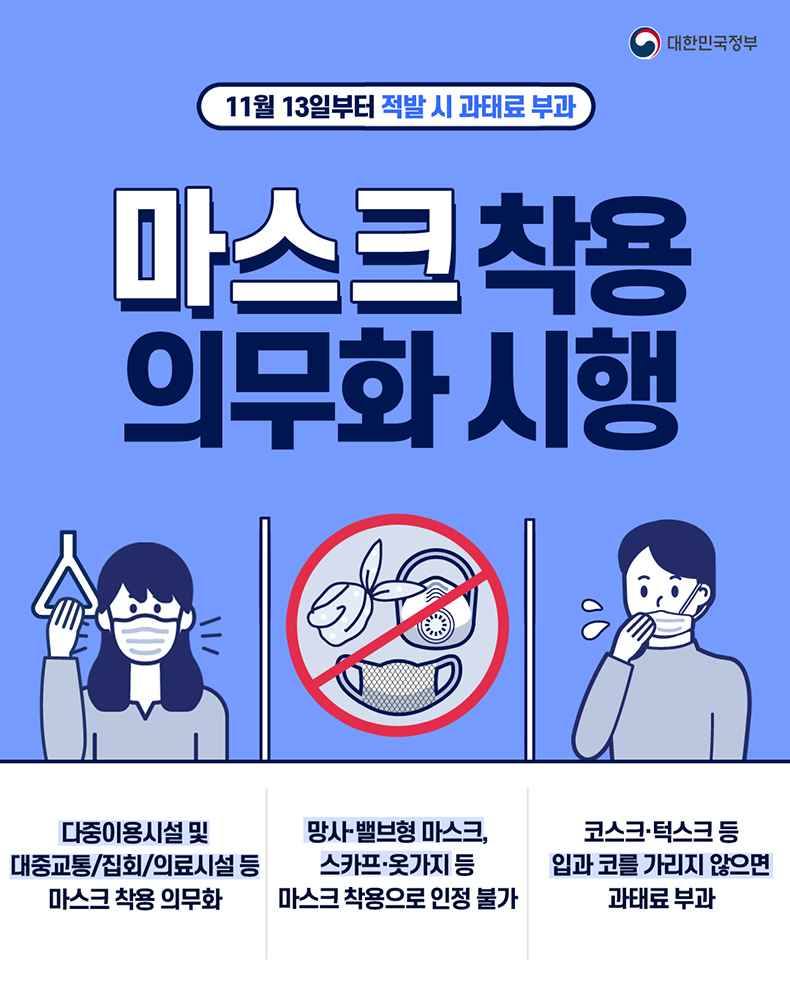 코로나19로 인한 마스크 착용 법령이 의무화 되었습니다.