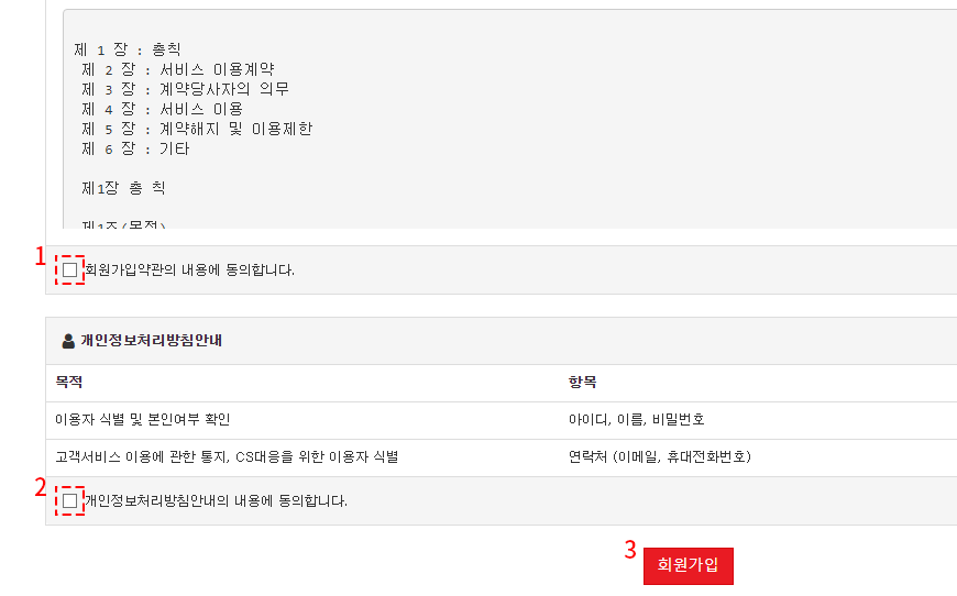 - 회원가입 약관 두 가지 확인 후 [체크박스] 선택 후 [회원가입] 버튼을 누릅니다.